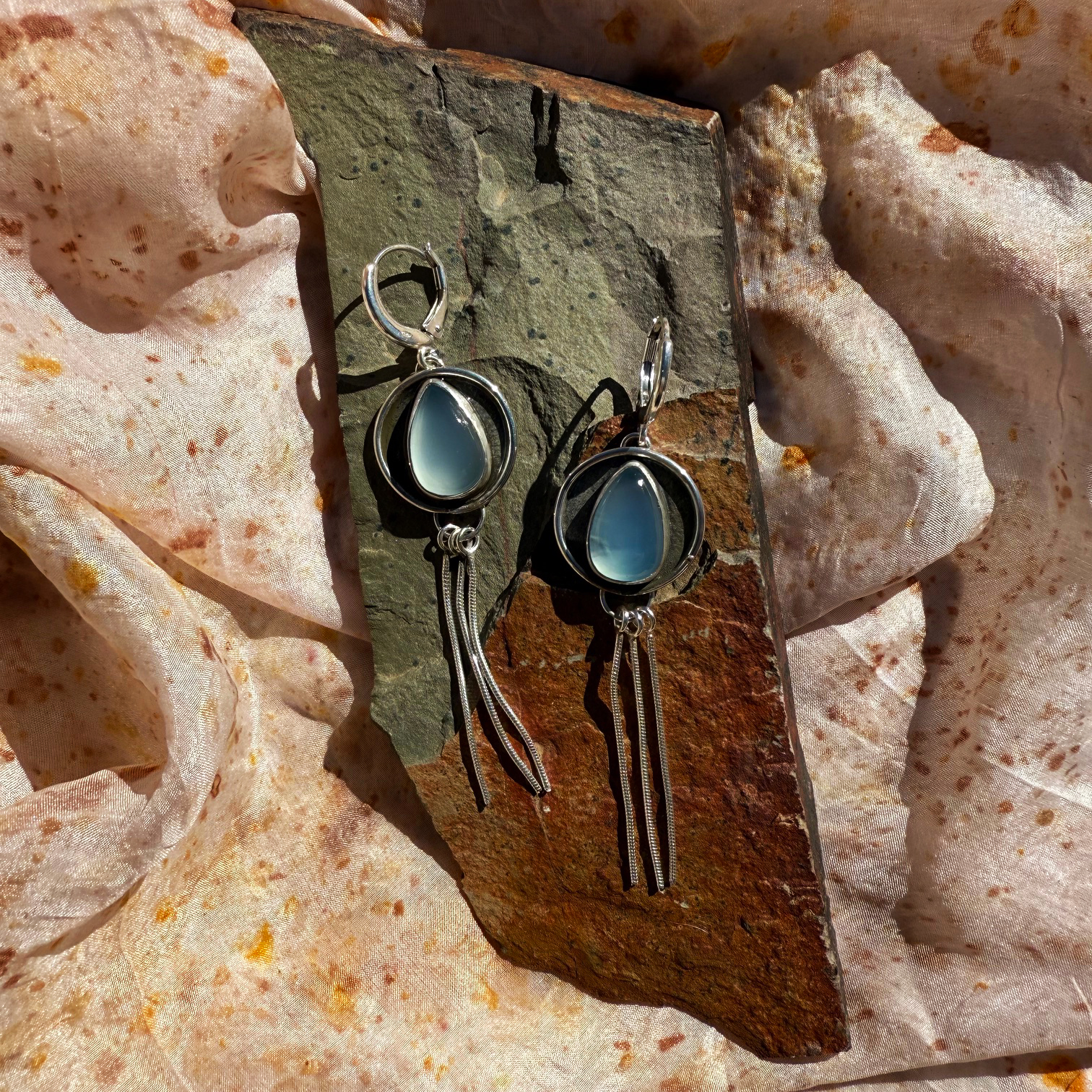 The second I saw these stones, I knew that I needed to make something special with them! Similar to the blue chalcedony found in Nevada’s Reese River Valley, these teardrop beauties will surely put you in a Silver State of mind. Made with all sterling silver materials, the silver backing is about nickel sized with silver fringe adding lovely movement.