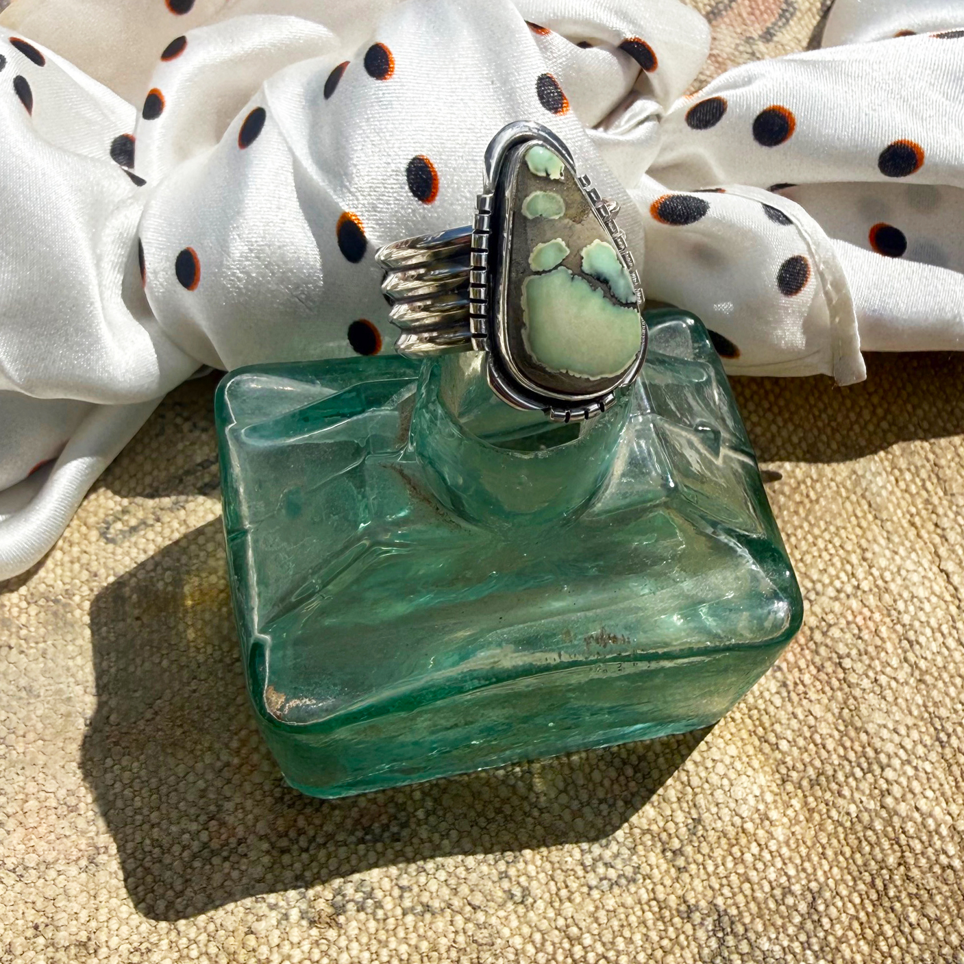 She’s a sagey-gray dream! Called Desert Bloom, this Nevada variscite was mined and made by Nevadans, and made into a ring with all sterling silver materials. The stone is about an inch long, and features a hand-sawed sterling silver border, and four-wide triangle style band. For those who like colors that trick the eye a bit—this one is for you.