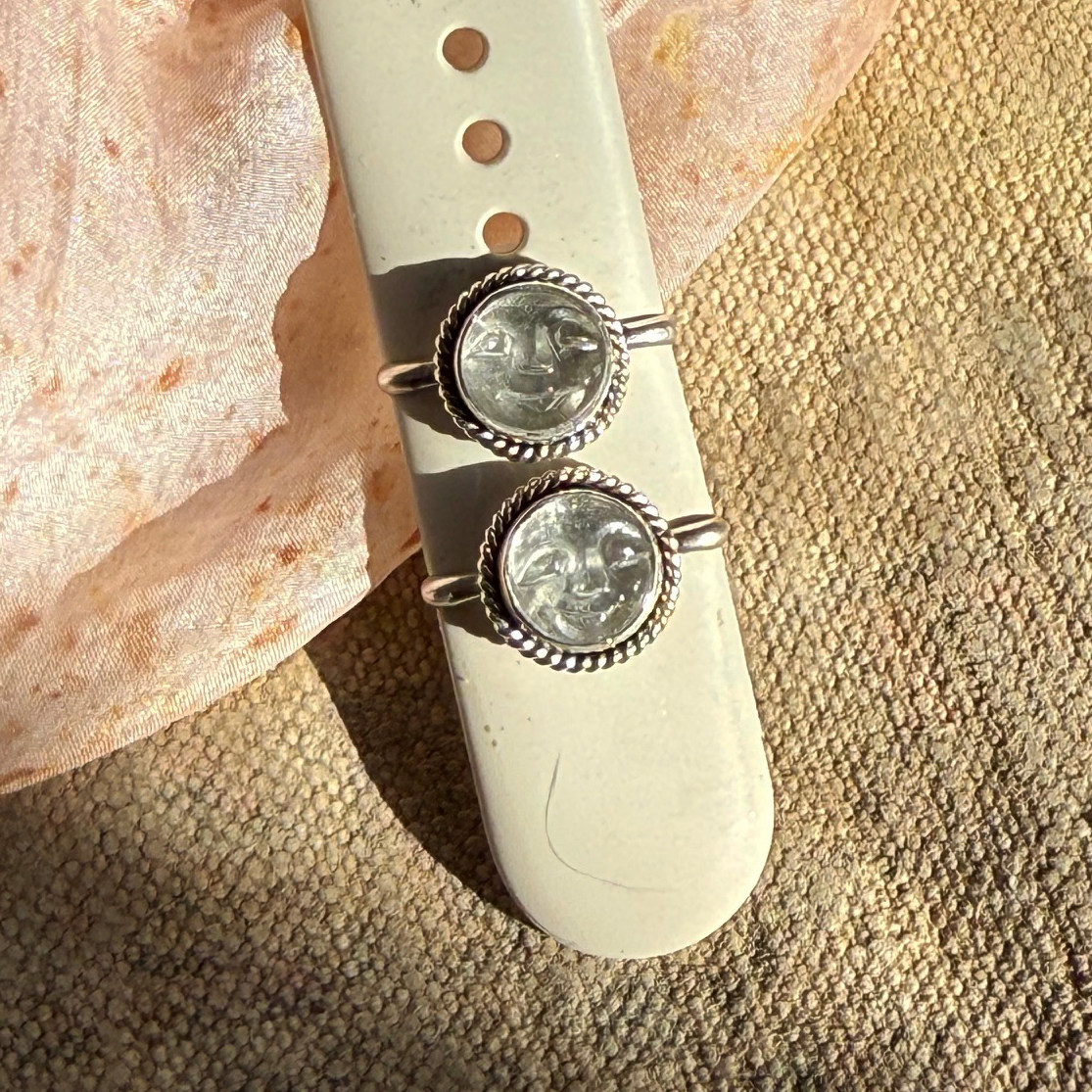 I love these psycho little moon face clear quartz stones! Made with all sterling silver materials, they are designed to slide onto an Apple Watch band, framing the watch face. They are one of one. Available now.