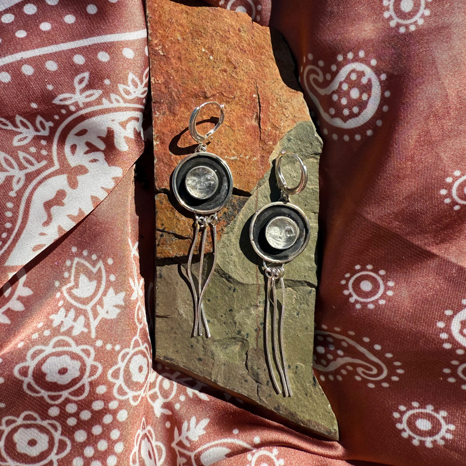 I got my hands on a bunch of these freaky little clear quartz moon faces, and I’m obsessed. I’ve got a matching ring somewhere in my shop, too. Featuring little moon faces hand carved into clear quartz, these earrings not only go with any outfit, but also celebrate some of my favorite experiences out there beneath Nevada’s dark skies. Each earring is about nickel sized, and made with all sterling silver materials.