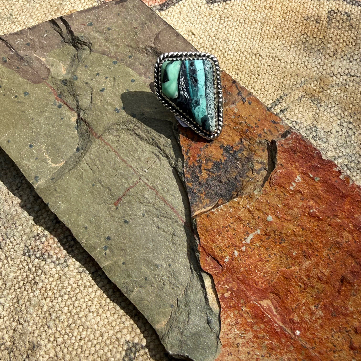 Mined and made by Michael Britton, this Mystic Sage Nevada turquoise and variscite hat pin is about nickel-sized and made with all sterling silver materials. Sure to complement your favorite flat hat, lapel, purse, camera bag, or anywhere else you want to showcase your love of the Great Basin State, it’s one of a kind.