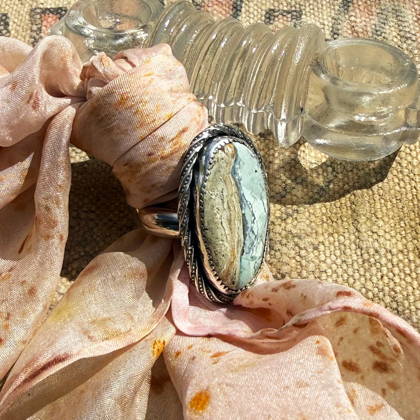 Featuring muted earth tones emblematic of the high desert landscapes this stone was pried from, this is a special stone. Mined and cabbed by its claim owner Michael Britton, this 2″ long stone features a part tan, part teal blue turquoise stone mined from a turquoise mine near Nevada’s geographic center. The ring is made with all sterling silver materials including a thick, solid sterling band size 7. The ring is one of a kind, available now.