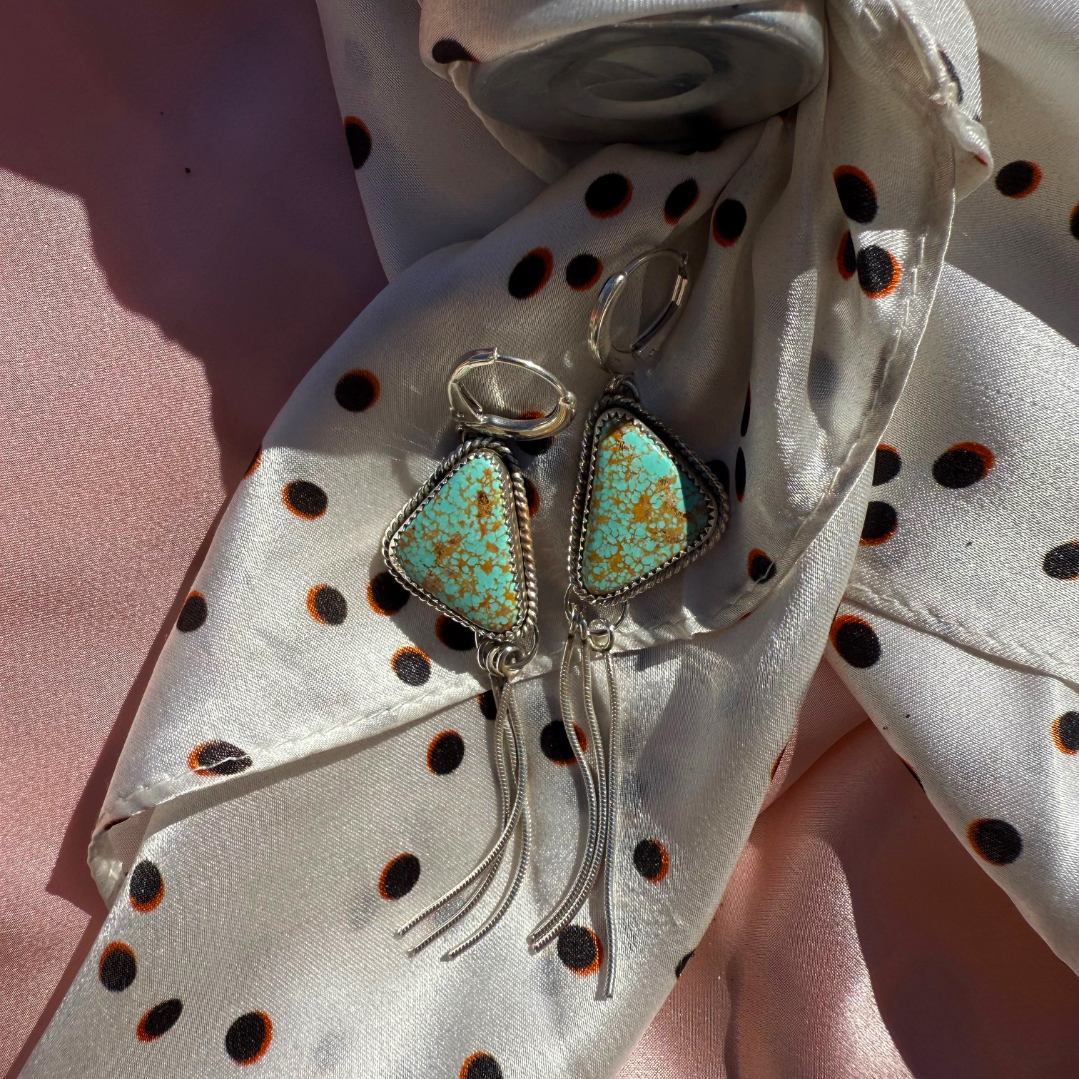 These stones! Some of my favorites in the batch, these Number 8 Nevada Turquoise earrings are gorgeous! While some Number 8 turquoise features more prominently separated blues and browns, with these stones, they sort of beautifully blend together. Each stone is a little larger than a nickel, made with all sterling silver materials, and mined and made by Nevadans.