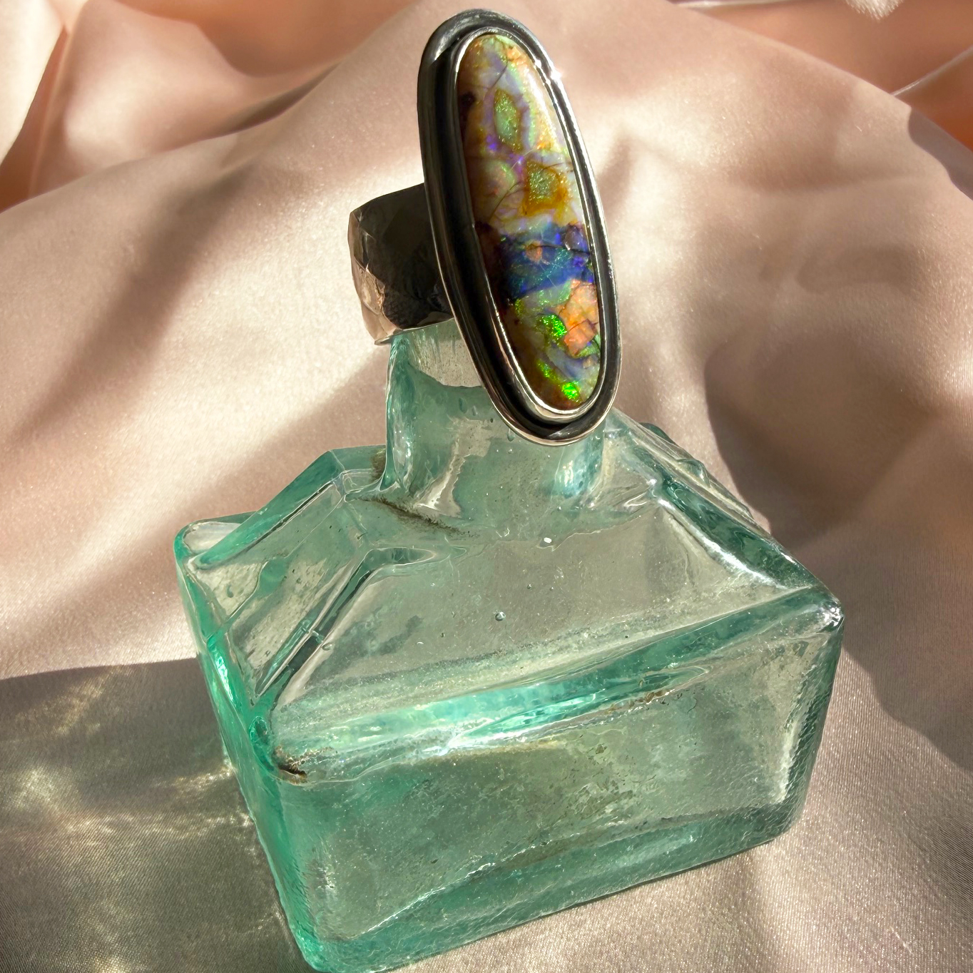 I’ve been saving this stone for something special, and excited about how this ring came out! Made with all sterling silver materials, this lab opal measures 1.25″ long and features brilliant flashes of just about every hue on the color spectrum. I am trying out some new ring shanks too—this one is thin yet wide, with a diamond pattern. Size 7, available now.