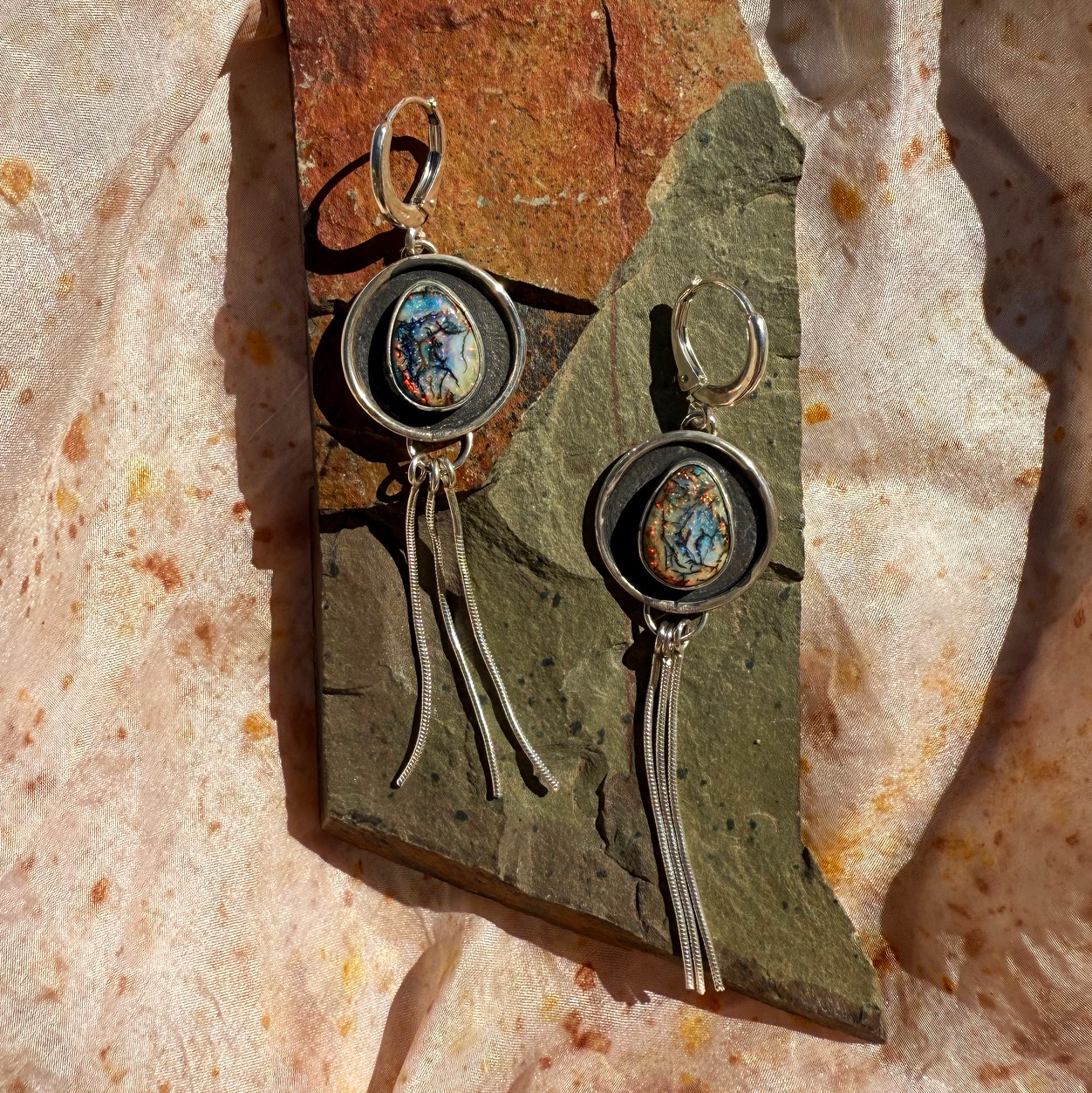 With color flashes about every hue of the color spectrum, these opals are stunners! Made with all sterling silver materials, each earring is about nickel-sized. They are one of one.